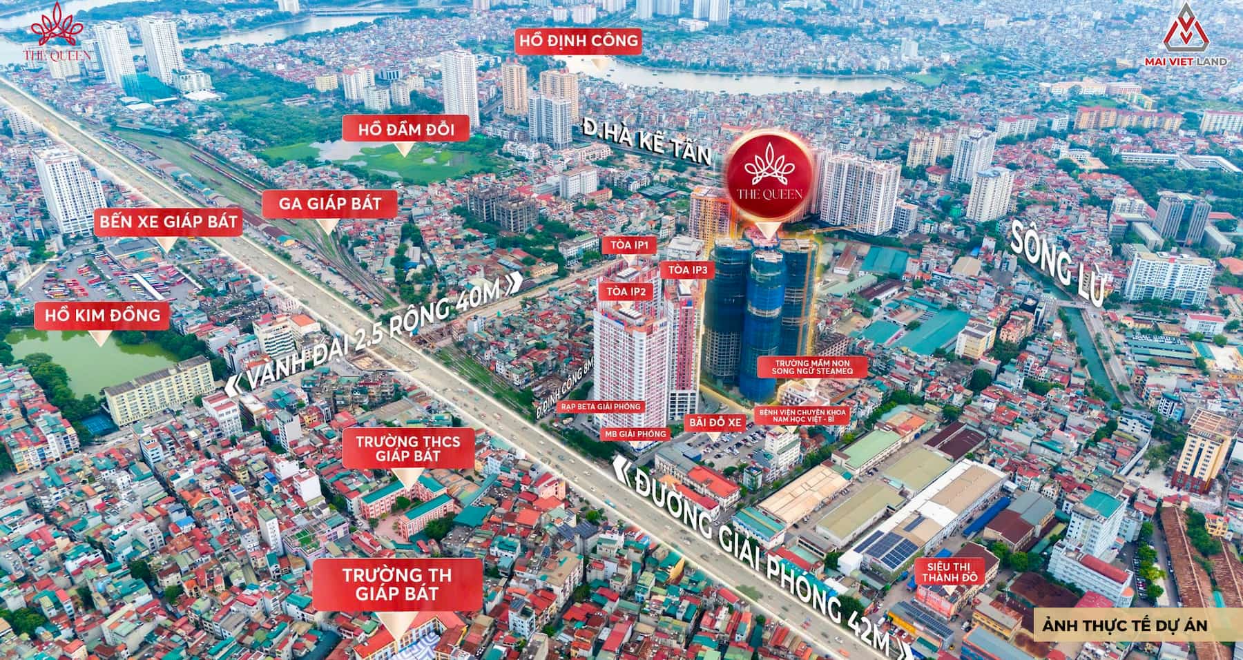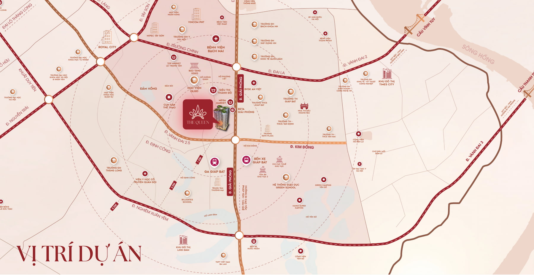 Vị trí Dự án The Queen sở hữu vị trí đắc địa tại số 360 Giải Phóng, Thanh Xuân, Hà Nội. Đây là khu vực giao lộ của đường Định Công và đường Giải Phóng gần đường vành đai 2.5, là nơi giao thoa của 3 quận của Hà Nội là quận Thanh Xuân, Hai Bà Trưng, Hoàng Mai với cộng đồng cư dân đông đúc, hội tụ đầy đủ dịch vụ tiện ích từ trường học, bệnh viện, trung tâm thương mại, mua sắm.