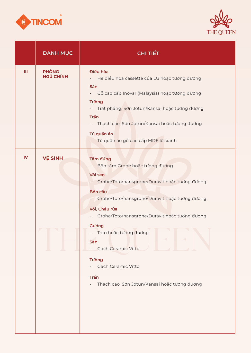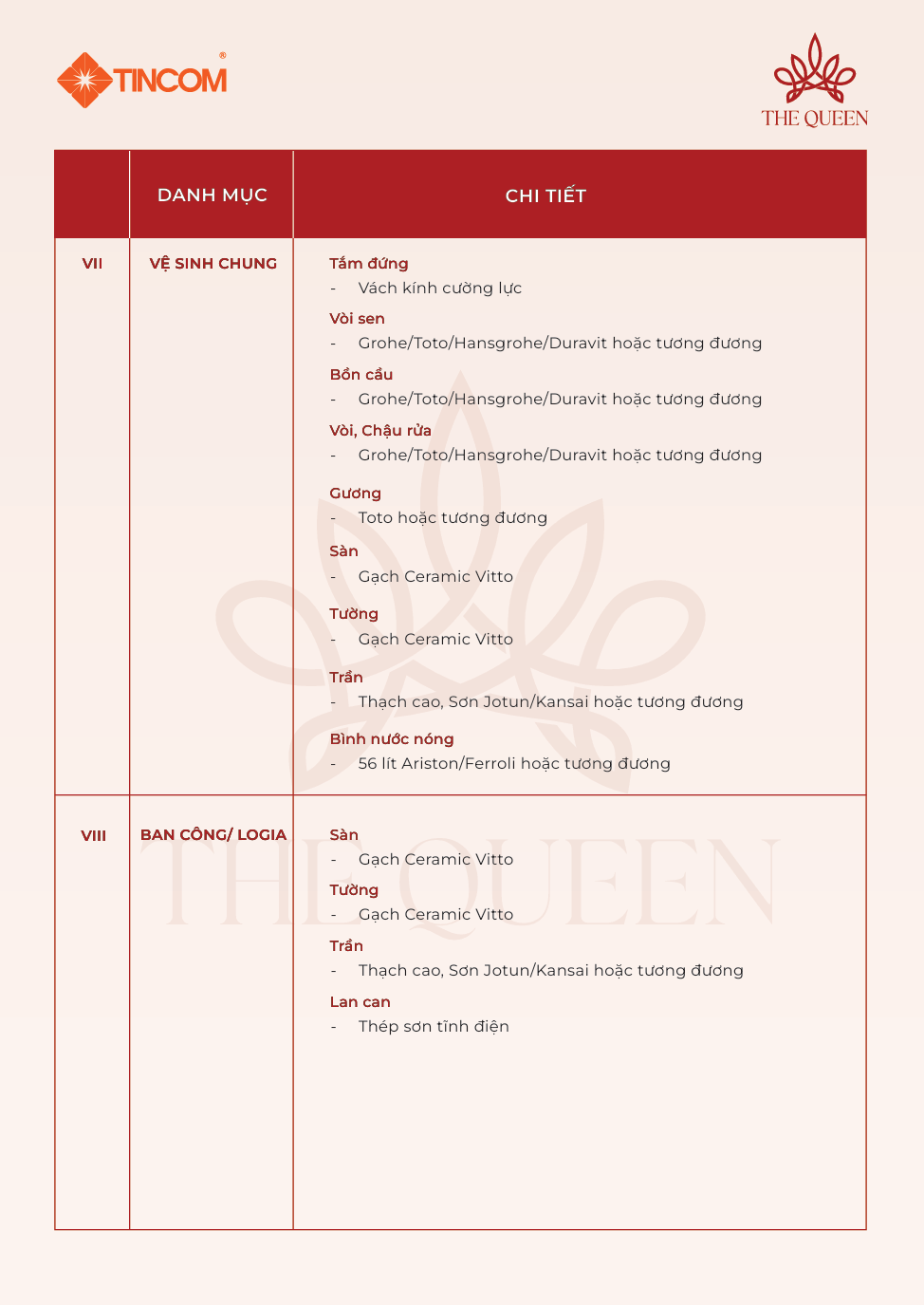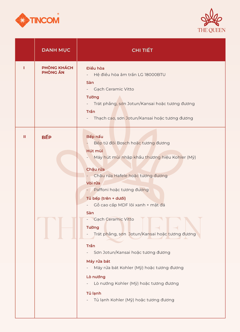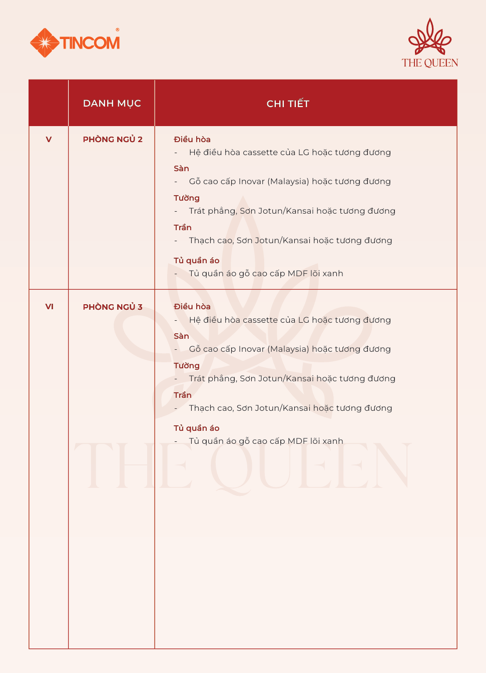 Danh mục nội thất dự án The Queen