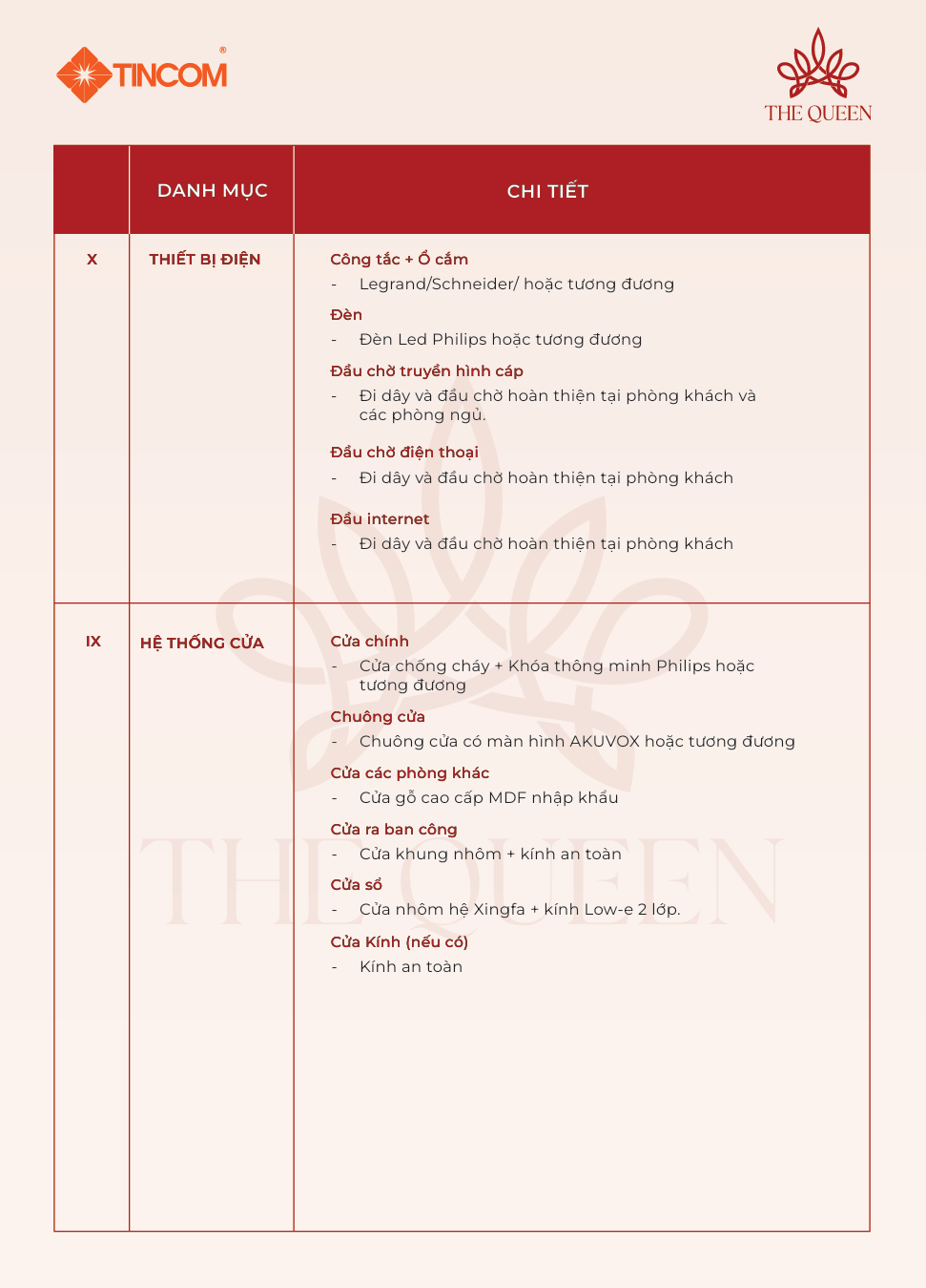 Danh mục bàn giao căn hộ the Queen